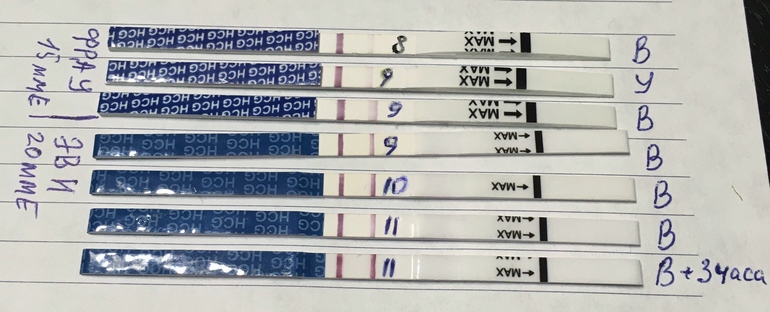 Тесты я не делала, но тут дело не в выдержке, правильно девочки пишут -уж очень их результаты подвержены всякому воздействию. Увидел полоску бледнее и все! Обморок! Поэтому я ходила на хгч, и даже каждый день, чтобы быть спокойной, что он растет. У меня кстати при хгч 837 и 2207 были абсолютно одинаковые не сильно яркие полосочки. После первого узи подуспокоилась с хгч и теперь жду следующего. Удачи вам! Все у вас хорошо!