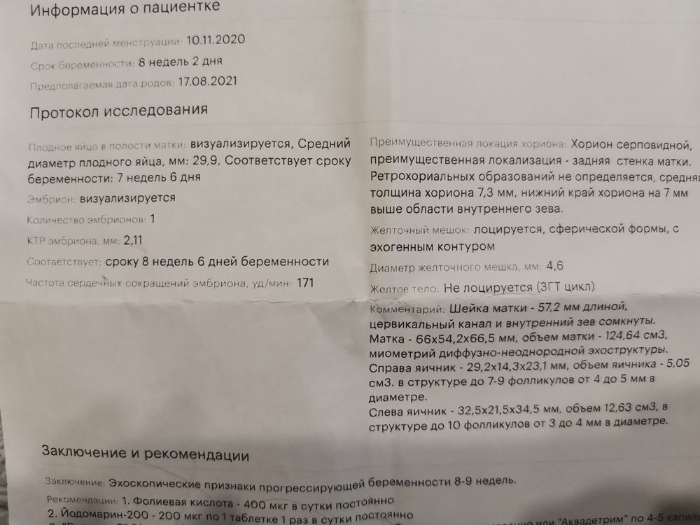 На первом УЗИ на 24 ДПП ( срок по мес.5+6) плодное яйцо было 13.6, КТР 5.1. в расшифровке пя развито на 5 Нед+4, эмбрион 6 Нед+2. Т.е плодное яйцо отставало по сроку, а эмбрион опережал.СБ было 118 уд/мин. Я тогда успокоилась и не забивала голову перед праздниками.