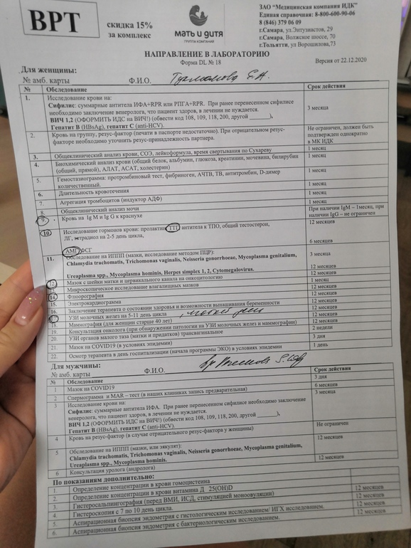 Вообщем ситуация такая, у мужа плохая СГ, мф бесплодия. Обратилась в клинику по месту жительства, о вопросе эко, что к чему и куда нужно подать документы для квоты на Эко... На мои вопросы моя гинеколог ничего ничего не ответила и выписала направление к репродуктологу (бесплатно), бесплатно не попала, так как из-за ковила, там очередь... Пошла платно к репродуктологу, где планирую делать эко, там она рассказала, что к чему, что у мужа действительно все не радужно и я могу пойти на Эко. Осмотрела меня, дала бумажку, в которой написанно, какие анализы сдать нужно для нее(обвела эти анализы) и сказала придти, как их сдам, параллельно чтобы пошла к своему врачу гинекологу и попросила список документов, которые нужно будет ей сдать. Пошла я значит к ней, а она говорит мы списков не даём, мол, ничего не знаю, все они дают 👍Класс! Дала ей листочек с тем, что мне дала врач репродуктолог, она начала по тому списку что она мне дала выписывать направления на бесплатные анализы, котя список то должен быть её, как я поняла...
