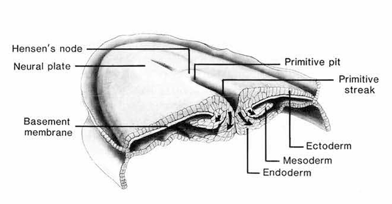 Так выглядит гаструляция в зародыше человека. Клетки верхнего слоя выселяются во внутренний слой через гензеновский узелок (ямка в начале первичной полоски) и образуют внутренний слой (первый поток миграции), а затем средний слой (второй поток)