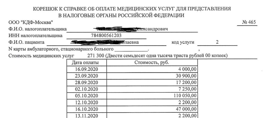 Мне мед.учреждение выписало справку на мужа, что он оплачивал за меня (жену) и указана общая сумма всех манипуляций, код стоит 2 на все. (препараты там же покупала) Соответственно, возврат будет с полной суммы.