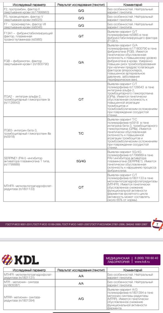 Обратите внимание на itga2, itgb в сочетании ранние потери беременности, хотя многие гематологи не берут это во внимание, сама только на днях узнала. Было уже 3 потери.
