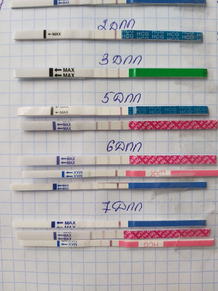 В день переноса прегнил 5000 , после уколов хгч небыло.судя по табличке которую откопала тут на сайте , на 7й день в крови остаётся порядка 9 ме хгч от такого укола .делала тест сегодня, один утром (синий) и один в обед (самый нижний)чувствительность 25 ме выглядит он вот так