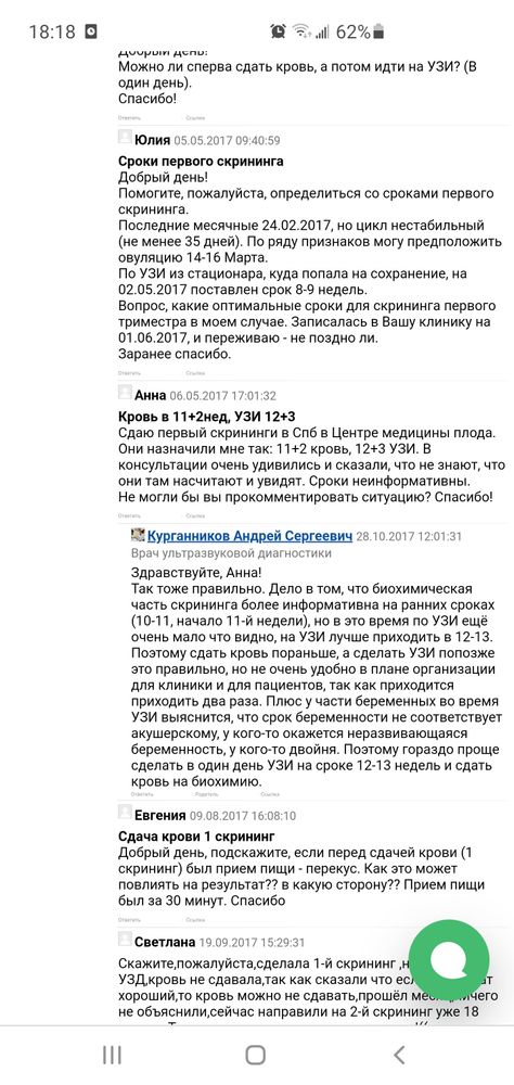 Анализы и процедуры. Помощь в расшифровке результатовдевочки мой гематолог посоветовал мне клинику где сделать 1 скрининг, я ему доверяю, дал на выбор 4. в одной из них кровь и узи рекомендуется делать на разных сроках. те сначала кровь, а позже узи.