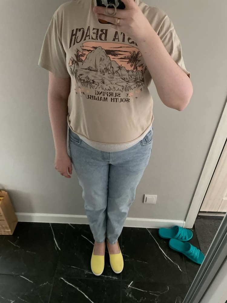 🍓Купила себе джинсы для беременных, ибо в спортивных штанах стало резко жарко, а летние платья я пока не рискую носить. Свои добеременные джинсы тоже могу надеть, но как-то уже в области живота некомфортно. Еще прикупила себе две футболки и на беременный живот, и с секретами для кормления. Интересно опробовать в деле. Прикольно так)) Вот в вещах для беременных и кормящих я ощутила себя беременной. И двое слипонов на лето - желтые (на фото) и белые еще. Удобно!