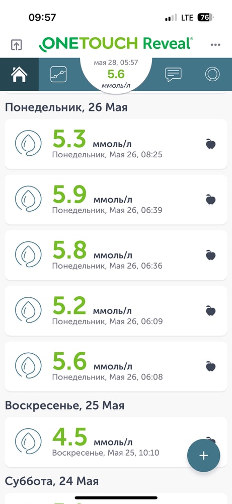 26.05.25 , перед сдачей крови в жк, проверяю сахар на гдюкомеире несколько раз и вижу показатели от 5.2 до 5.9. Естественно переживаю , что идти показатели даже с инсулином на голодный желудок не очень хорошие. Сдаю кровь, и показатель приходит 4.6 и всё отлично. Теперь измеряя сахар на глюкометре не очень вериться его показаниям.