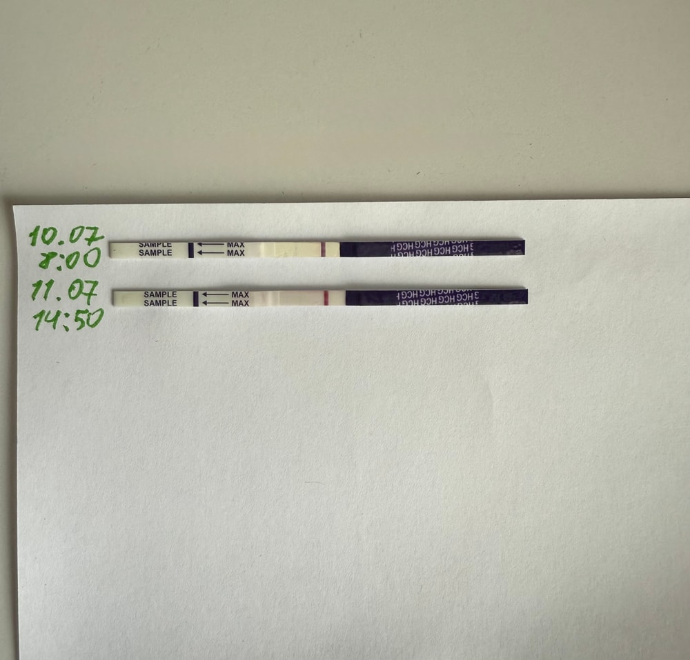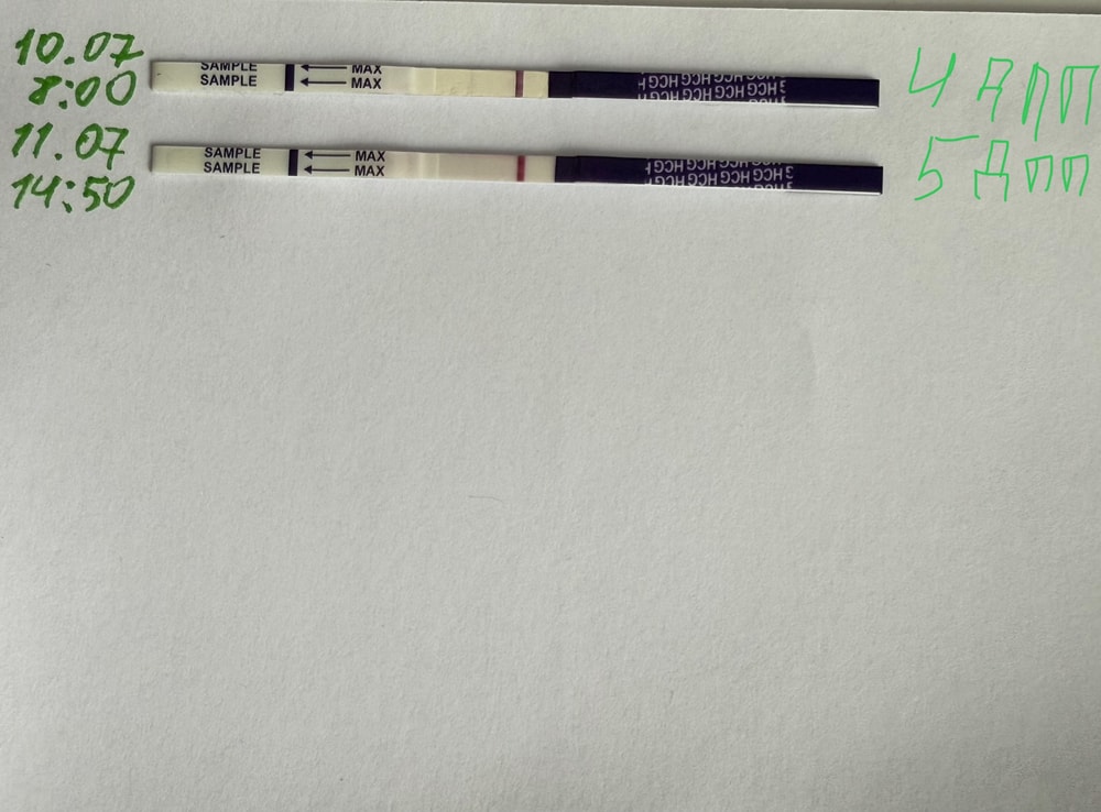 Разглядываем тесты // пока ждём результат ХГЧДевочки, что думаете? Был перенос двух эмбрионов. Прикладываю фото вчерашнего теста и сегодняшнего. Укол хгч был 2 июля. Как думаете, всё получилось или это хвост от укола?