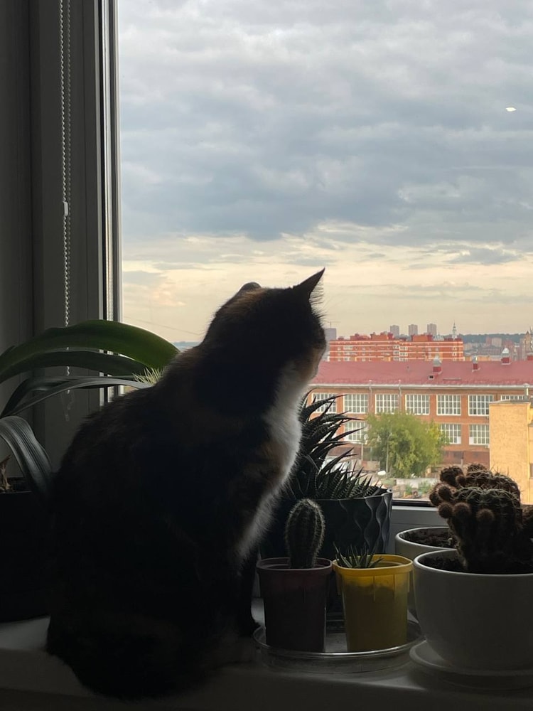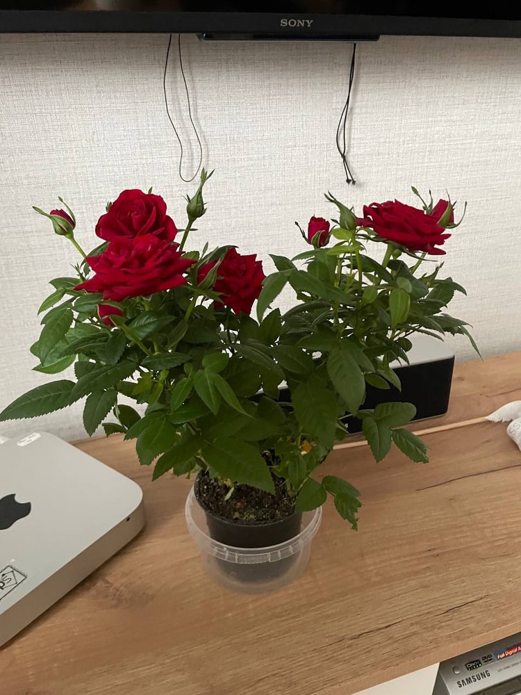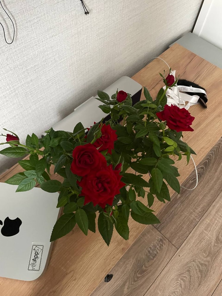 К приятным новостям, я купила кустовую розу. Очень надеюсь, что она не сдохнет в нашей жаре и климате квартирном даже с кондеями. Пока все ок. Очень красивая, я давно хотела! Кошки рады – нюхают и нюхают.