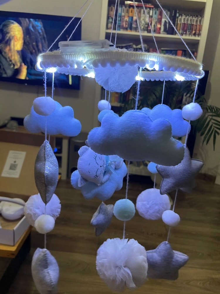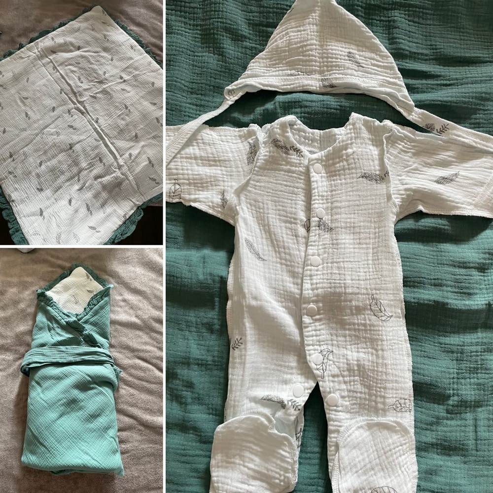 Комплект на выписку подготовила. Муслиновый зеленый — это прям любовь! Я вообще повернулась на зеленом цвете! А на случай холода вот такой теплый флисовый комбез 56 размера готов. Себе вещи на выписку еще не подготовила, а надо бы… Еще пришел мобиль на кроватку. Музыкальный, с подсветкой, фетровый, крутится. Очень красивый!