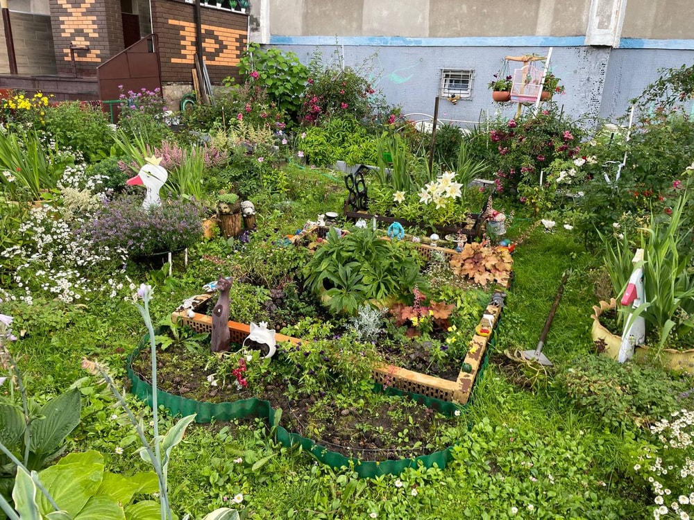 А еще у нас возле дома в цветниках вот такая красота каждый год (еще и обновляют все). Фигурки, игрушки, цветы, елки, лебеди из покрышек и дерева, скворечники и тд. Маленькие детки подходят и разглядывают, пальчиком тыкают. Это так забавно! Фасад дома у нас расписан детскими рисунками (на фото не видно), тоже прикольно. Глаз радует!