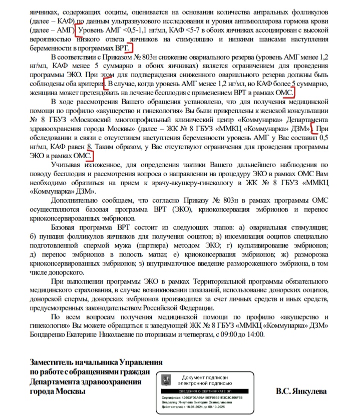 У меня в связи с этим ответом Минздрава, появилась мысль подать в суд на "Коммунарку" ,чтобы мне возместили стоимость второго протокола. В 2024 году я каждый месяц делала узи вначале цикла в частной клинике,и считала фолл-лы, их всегда было больше 5-ти. Но правда амг был совсем низкий= 0,09. Прошерстила ЕМИАС за 2023 год, к сожалению записей "об ограничении ЭКО по ОМС" нет. Говорили на словах. Кстати, в 2023 году у меня тоже было не меньше 5 фолл.