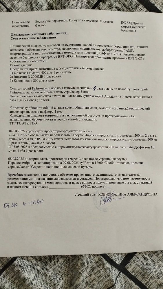 2.08.2025 ходила на приём к репродуктологу Ковчун А. А. "Мать и дитя", Владивосток.