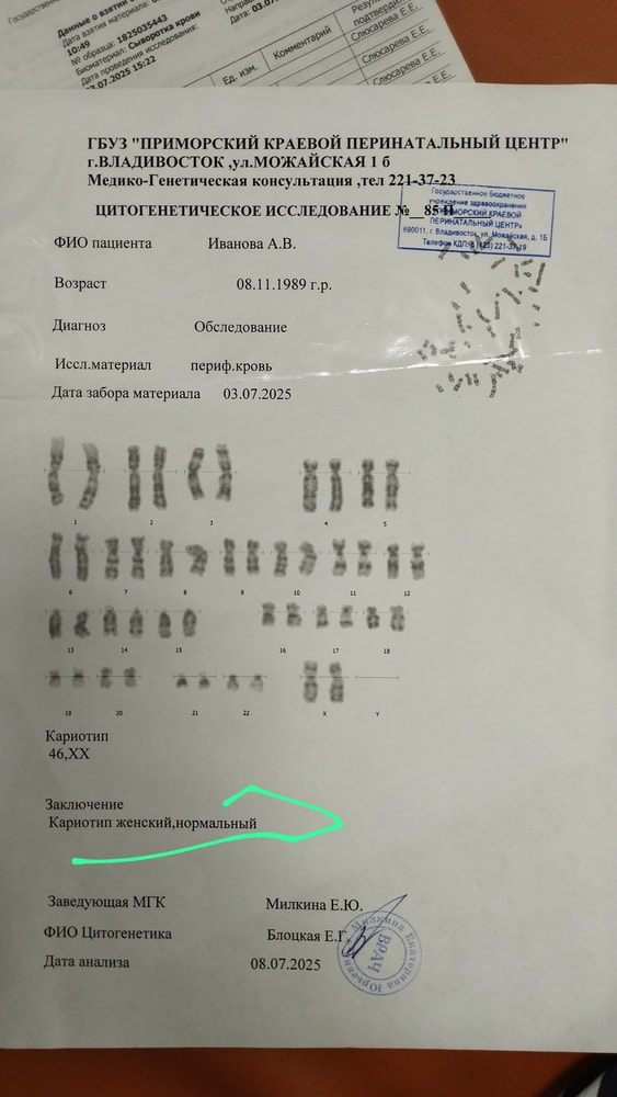 Вот еще сдавала кариотип - супер, всё норм 👌.