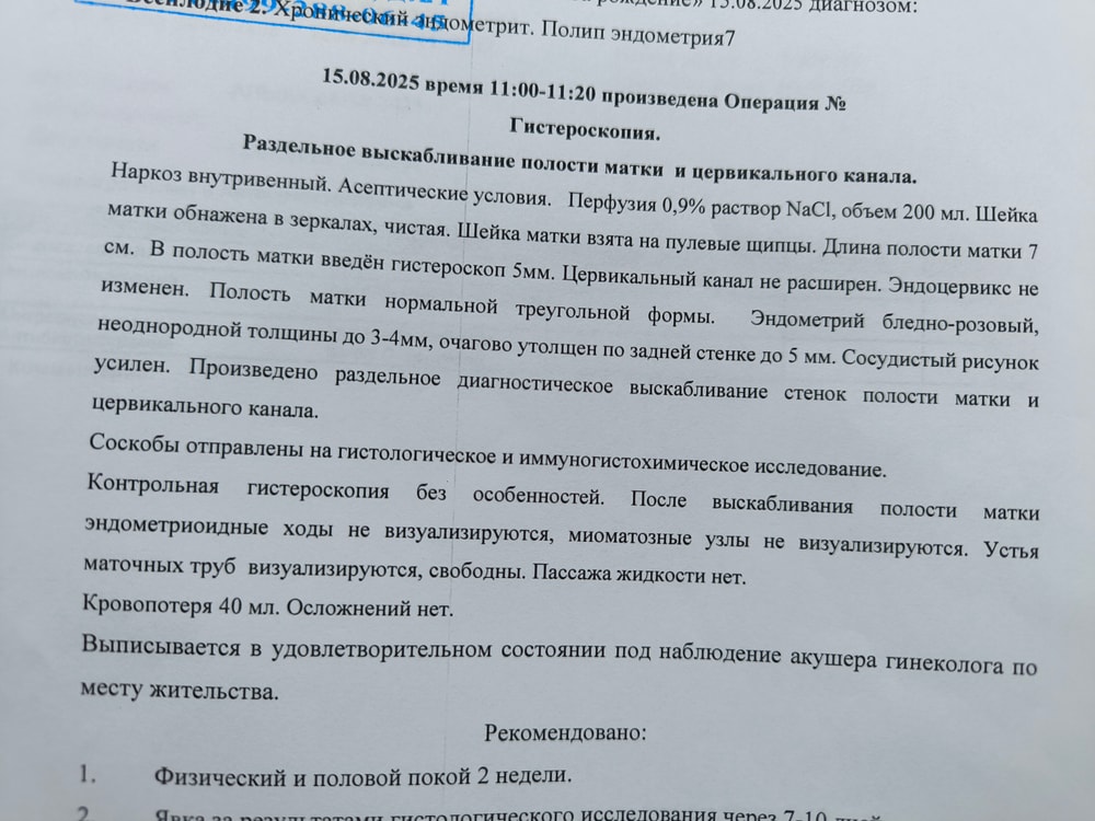 Выигравшая первый бой, да я жду, вопрос был в том, увидели ли полип на гистере и указано ли это в выписке. И есть ли в выписке хр.эндометрит