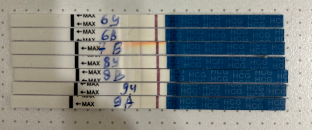 Очень маленькие интервалы. У вас тесты мамачек или эвик, судя по виду. Они очень долго держат одну расцветку. А сравнялись у меня полоски только при хгч за 2000. И дней 5-7 были плюс-минус одинаковые. Вы же воду пьете. Только сдавать хгч.