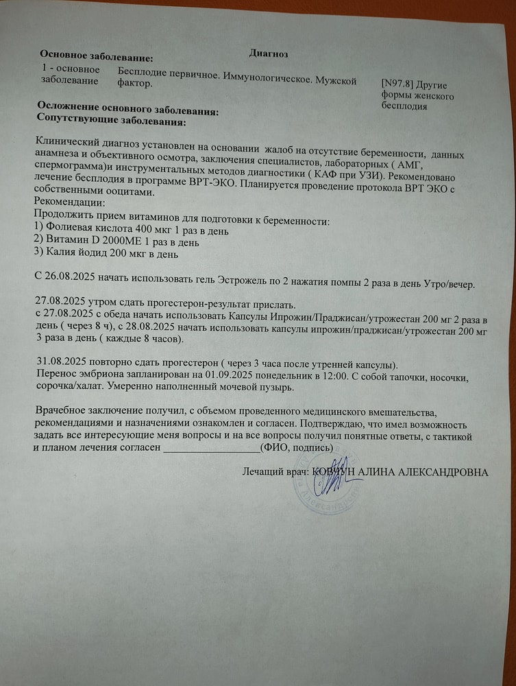 27. 08.2025 нужно утром сдать прогестерон, если он низкий, значит, криоперенос состоится 1. 09. 2025,