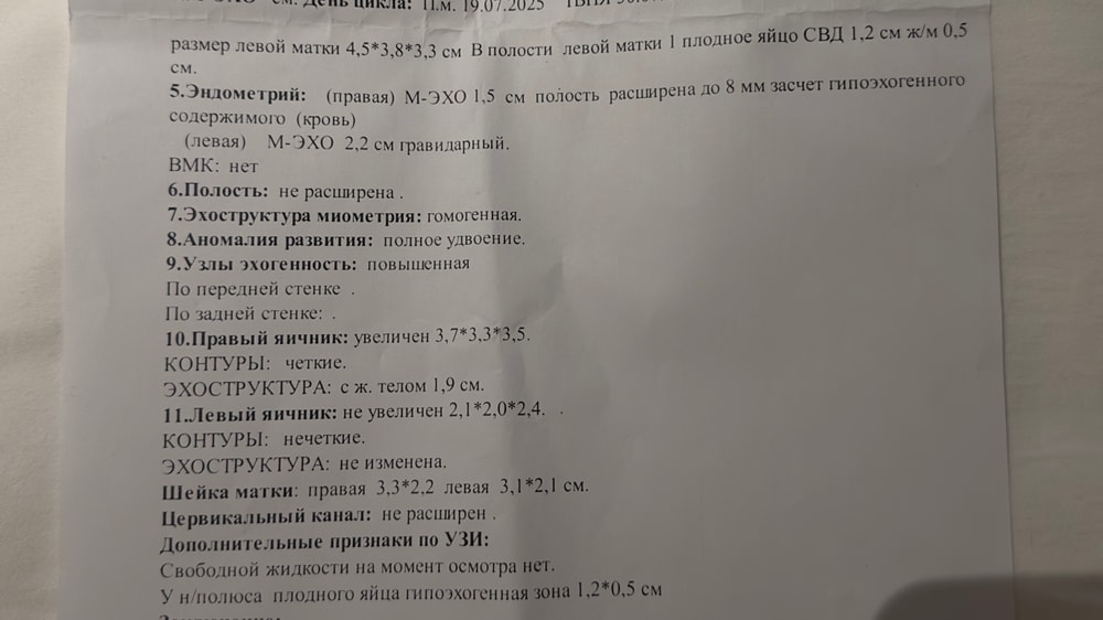 Полное удвоение матки (2 шейки, 2 матки), срок по месячным 6+2, размеры плодного яйца и желточного мешка нормальные, у нижнего полюса плодного яйца гематома, странно только, что жёлтое тело в правом яичнике (и овуляция была в нем), а беременность в левой матке, но перекрестное оплодотворение встречается, и что правая матка заполнена кровью.
