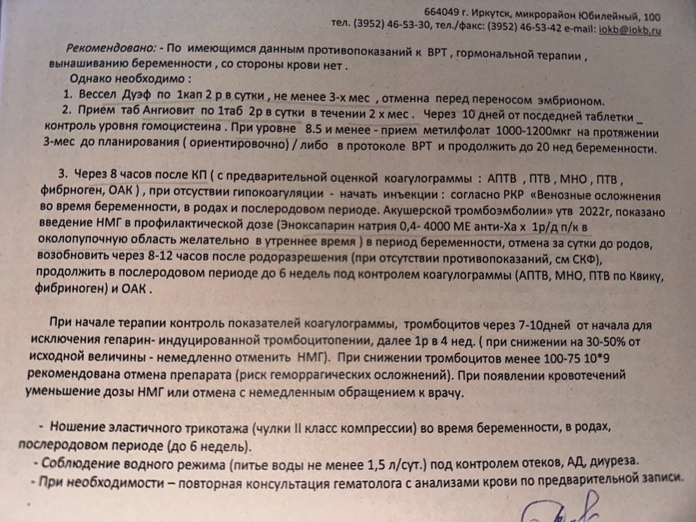 Добавлю к предыдущему посту. Данные два препарата отменила. Принимала: тромбо асс, Клексан 0,4 (пока), метилфолаты В9 и 12, стандартные витамины.