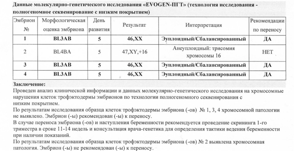 "Тут мы не можем отдифференцировать не несёт ли эмбрион такой же сбалансированной перестройки, как у супруга, поскольку метод направлен на выявление несбалансированного хромосомного дисбаланса. Поэтому эмбрион может как иметь нормальный кариотип, так и нести сбалансированную перестройку."