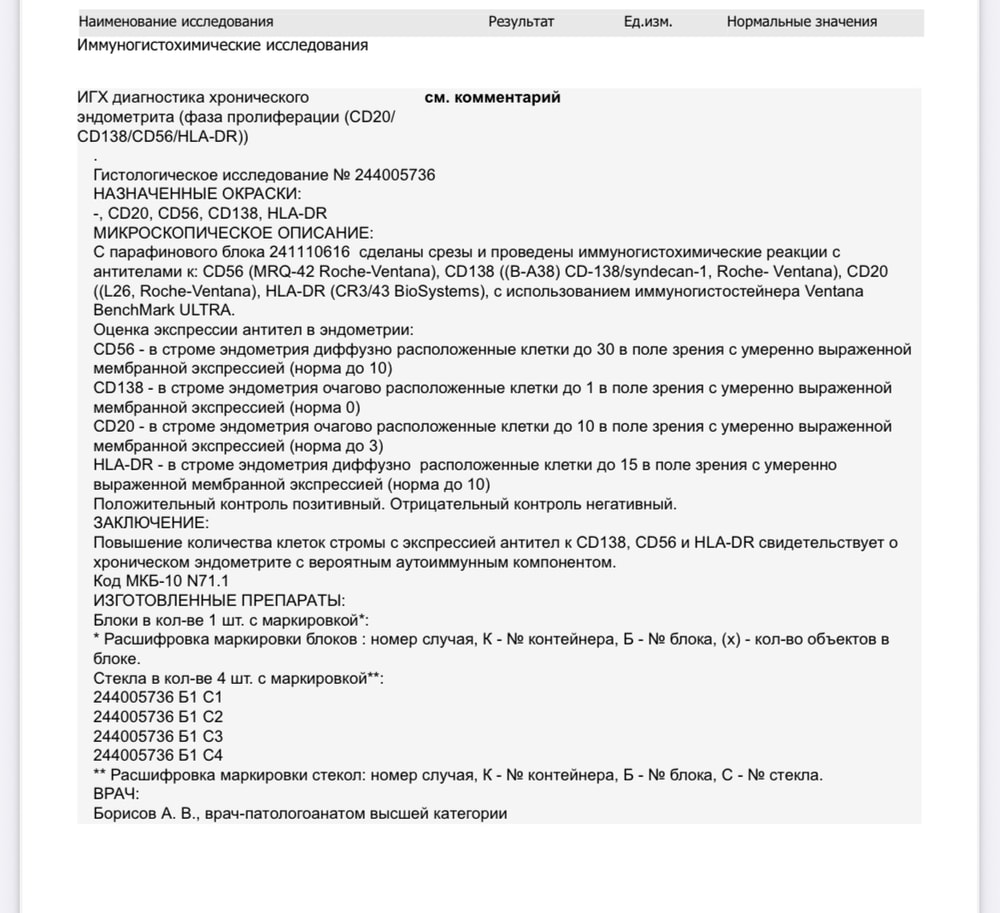 Anna, CD138+ (самый важный маркер): Это маркер плазмоцитов - клеток, которые вырабатывают антитела. В норме их в эндометрии быть не должно (норма 0). У меня они есть («до 1 в поле зрения»). Это - прямое и неоспоримое доказательство активного хронического эндометрита. Это та самая «фабрика воспаления». И в заключении все описано.