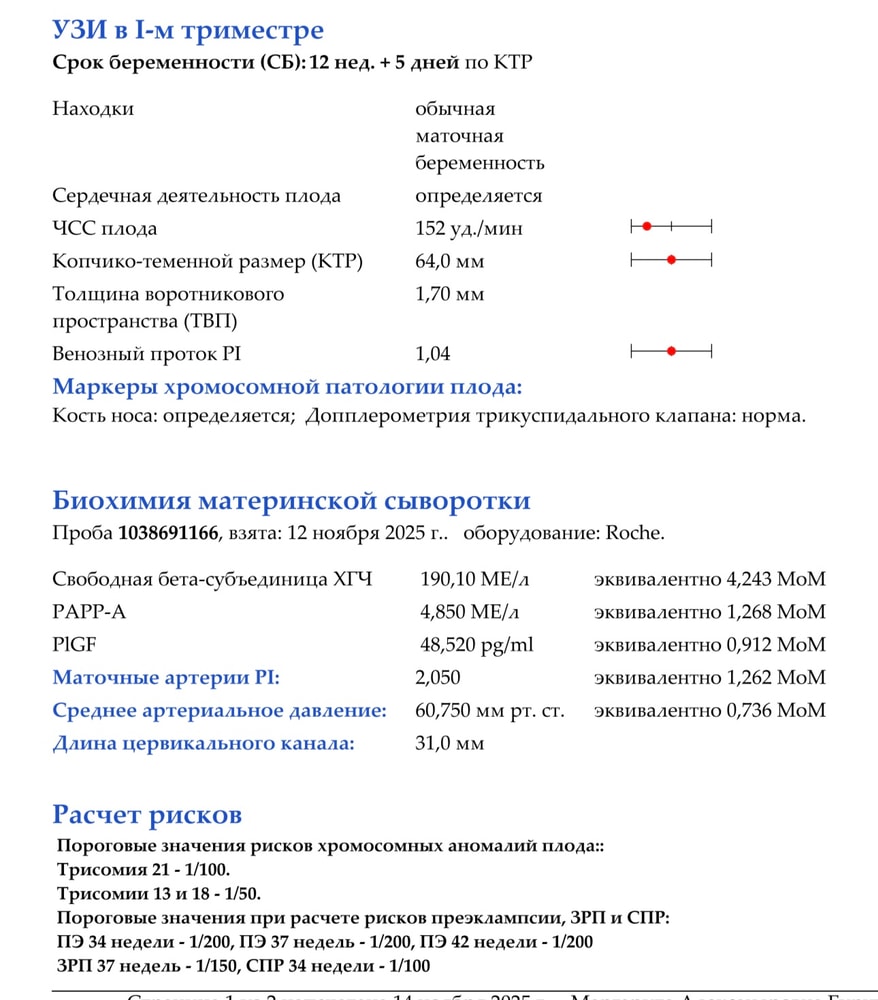 Результаты УЗИДевочки пришел результат первого скрининга по крови. ВЫСОКИЙ ХГЧ, аж 4,2 МооМ,при этом индивидуальные риски низкие по синдромам,и хороший НИПТ.