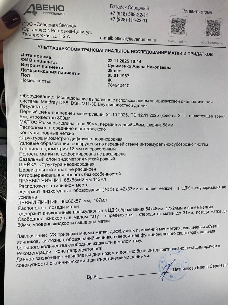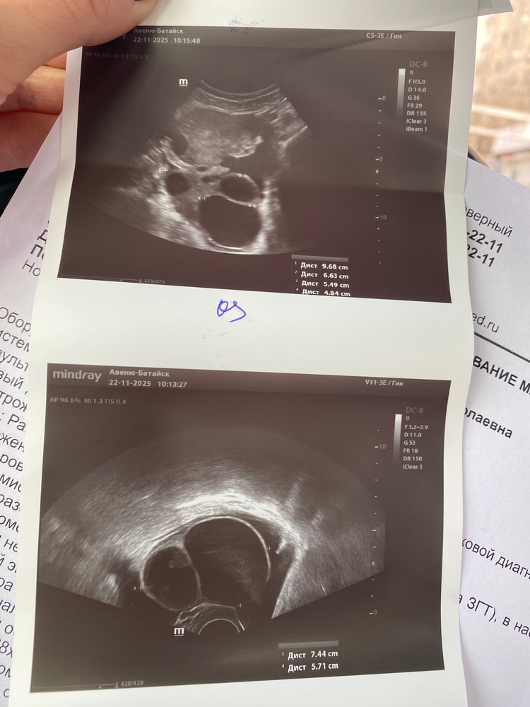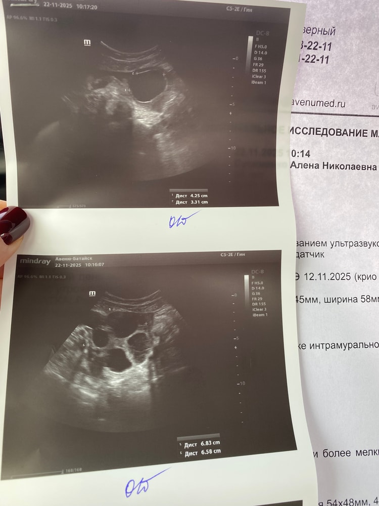 Анализы и процедуры. Помощь в расшифровке результатовКриоперенос был 12 ноября. Все прошло хорошо и чувствовала всю неделю после переноса себя отлично. Из поддержки прогинова 3 раза в день и утрожестан по 400 2 раза в день и тромбоас 100 мг в дерь. Сегодня 10 дпп , и с 7 дпп у меня начались большие проблемы по самочувствию: раздуло весь живот, он твердый, внизу живота в области придатков тянущие боли слева, при этом питание правильное, метеоризма нет. Вчера обратилась к гастроэнтерологу- проблему по её части не обнаружено. Этой ночью очень сильно усилилась тянущая боль придатков слева, прям сильно, невозможно было терпеть, тоесть прям ревела и загибалась от боли без преувеличения, думали вызвать скорую, выпила ношпу, папаверин свечку, кое как уснула. Выделений мажущих нет. Сегодня с утра сдавала кровь на хгч, как и должна была, и сделала УЗИ придатков- и как оказалось там очень много кист на яичника и очень много свободной жидкости. Не могу ходить даже, только лежать кое как, очень плохо. Своей Ре написала проблему, она на связь не выходит и на прием к ней записаться в ближайшие дни невозможно. Что со мной, что делать не знаю. Одно радует - Тест вчера делала : положительный, но вторая полоска не сильно яркая.