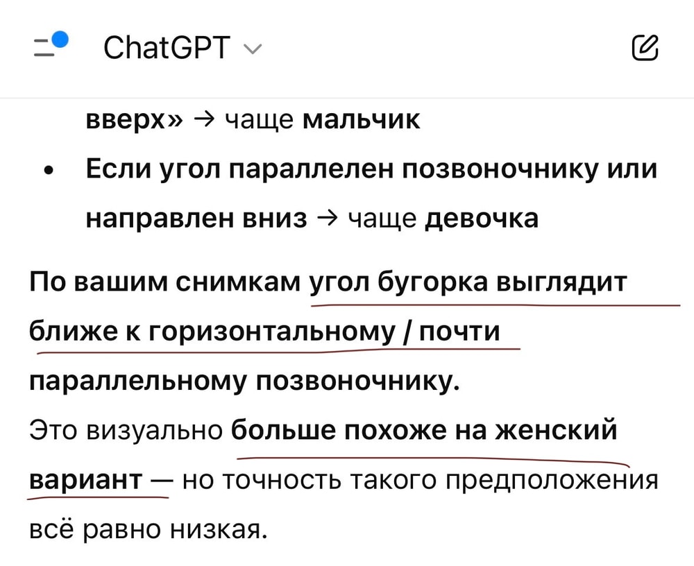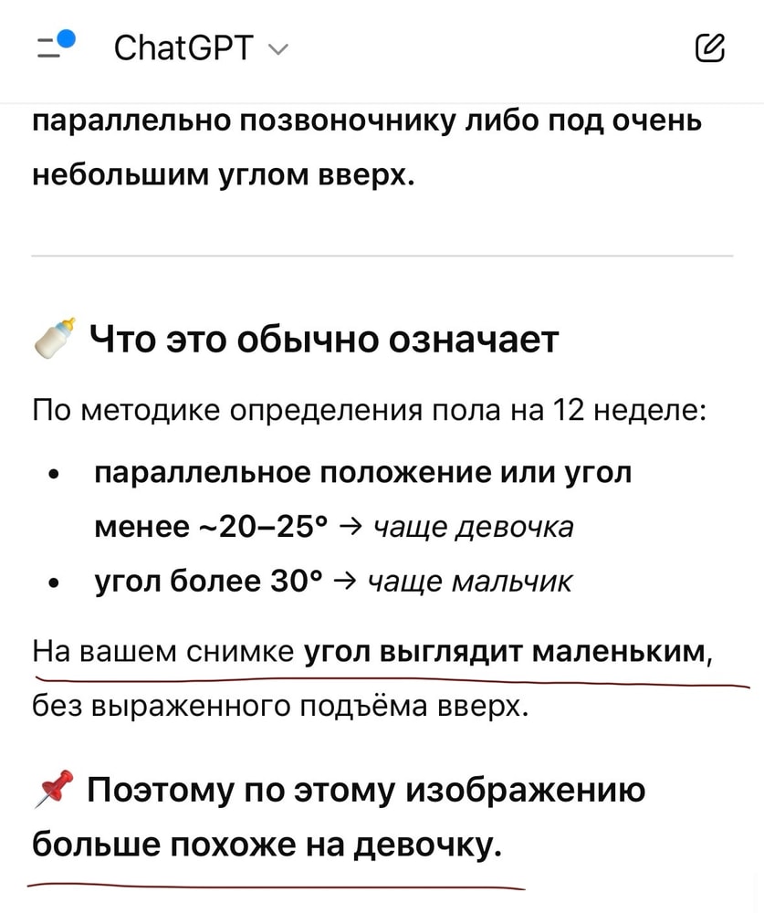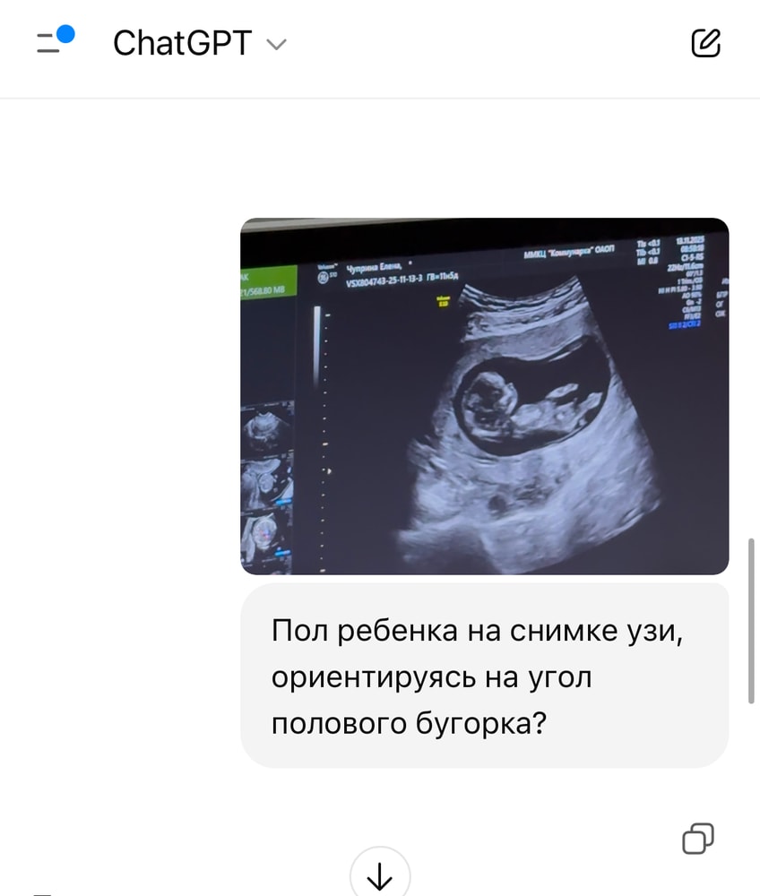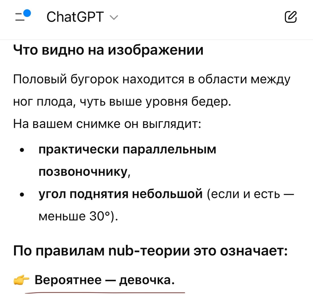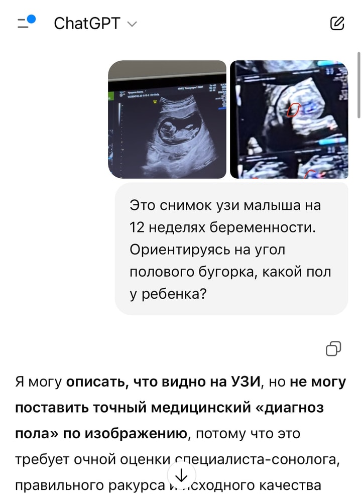 Так вот, попался мне тут в нельзяграмме рилс о том, как мамочки на 12-13 неделях загружают фото узи малышей, где виден половой бугорок, в чат GPT. И ИИ выдает информацию по полу малыша, конечно, с приставкой, что это не диагноз, а лишь предположение на основе анализа данных.