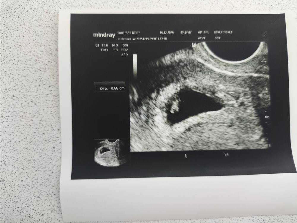 Дождалась первое УЗИ! Переживала всю неделю из за того что на 18 ДПП кровило, но все хорошо. Отслоек, гематом нет, эмбрион один, ктр 5,6.Услышали сердечко 122 уд в мин. В заключении прогрессирующая маточная беременность 6+4🥰