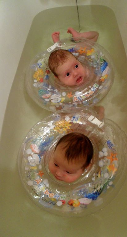 Поскольку пупки наши зажили, да и вообще - пора, начали купать малышню в проточной воде, в большой ванне и с кругами на шейках. И сразу проштрафились. С Надюшкой. Неправильно надели на неё круг, из-за чего наша девулечка расстроилась и плакала горько... Поэтому несколько первых купаний Надя хныкала. Но потом адаптировалась и купалась хорошо. Обычно мы Надюшку первой запускали плавать, потом я раздевала Сеньку, запускали, они плавали вдвоём, потом Надю доставали и одевали, Сеня плавал, потом его доставали. В общем - по очереди. Один раз у нас был казус ;)) Сенька активничал перед купанием, решили его первого запустить. И, соответственно, достать. Так вот я его понесла одевать, как вдруг муж кааааак заорёт! Я уж перепугалась! Забегаю в ванную с Сенькой на руках, а муж держит хнычущую Надю над ванной и ругается, что она укакалась ;))) В общем - сначала покипишевали, а потом поржали. Но это был единичный случай. А вообще так прикольно наблюдать, как эти маленькие попки плавают в ванной. Лёшка один плавал, а тут двое - места меньше, они друг друга задевают, ножками толкают. Так интересно, когда малыши уже начнут реагировать друг на друга?