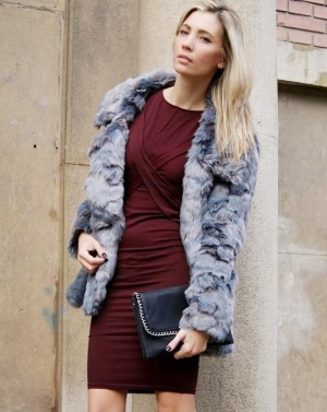 Вариант короткой шубы в черном или сером цвете отлично сочетается с бордовым вечерним платьем-футляром. Впрочем, с такой верхней одеждой красиво сочетаются и платья в шикарных затемненных оттенках фиолетового, синего и зеленого. Черная обувь, клатч-конверт - и можно смело отправляться на встречу с мужчиной вашей мечты.