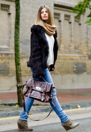Для ежедневных луков полушубок можно сочетать с обыкновенными джинсами и пуловером. Шарф-хомут и ботильоны на танкетке добавят изысканности образу. Дополнение - практичная объемная сумка из кожи