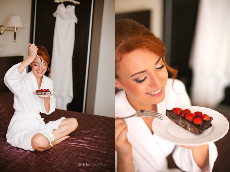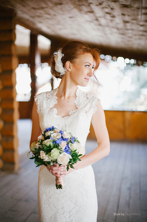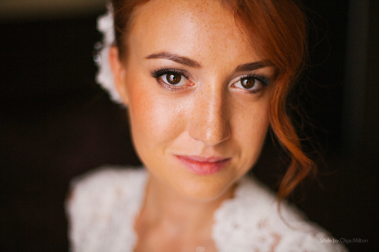 У невесты ярко-рыжие волосы и общий теплый цветотип.
