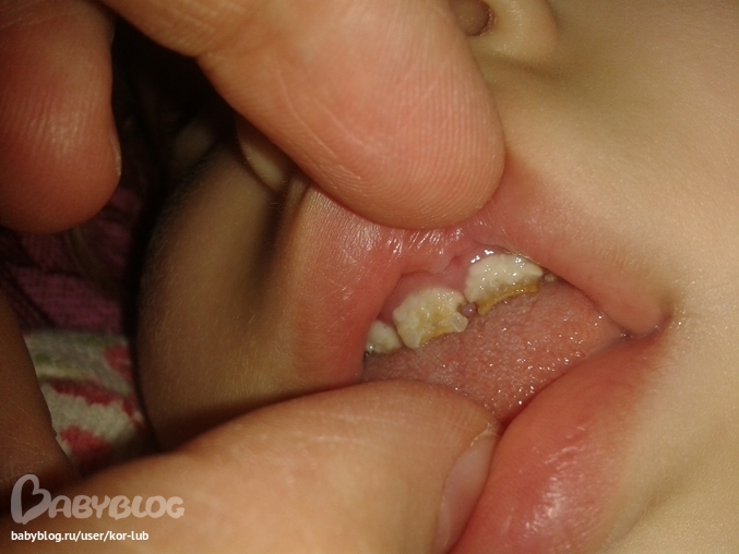 Теперь пошел и левый передний за ним, хотя был абсолютно здоров. и вторые зубы тоже начали портиться. сейчас мы чистим только нижние зубы, на них 2 точки кариеса. Верхние Соня чистить не дает, сразу орет что больно. Тут не давно играла, взяла игрушечную ложку зубами, а вытащила ее, на ней была кровь с верхней десны.