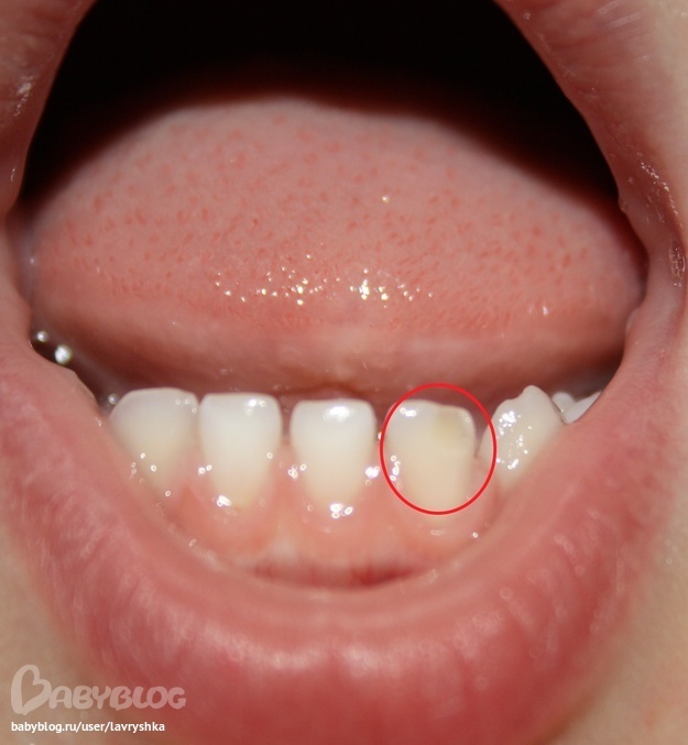 Верхний резец изнутри тоже маленько сколот. Видимо так сильно сомкнулась челюсь. Подскажите что нам делать с этим зубиком? Надо как то лечить? Зарание спасибо!!!