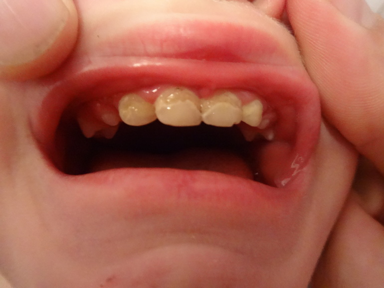 Добрый день! Моему ребенку 1 год 8 месяцев, пару месяцев назад на верхних зубах появился налетик, чистили, не помогало. А сегодня потрогала и обнаружила, что это не налет, а углубление. Что же с этим нам делать?