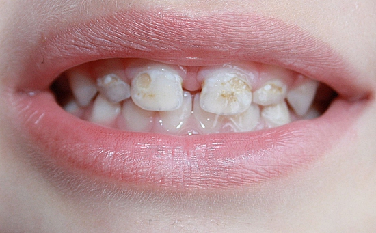 Но вот с передними вопросы остались, доктор их лечить не берется, говорит что нет смысла. Предложила фторировать - я отказалась. У нас на данный момент двоечки крошатся, одна почти до десны уже скрошилась, вторая наполовину. На единичках на одной немного темные пятна, а вот на второй дырочка как на фото ниже (фото не наше, нашла здесь). Изнутри эмаль темная.