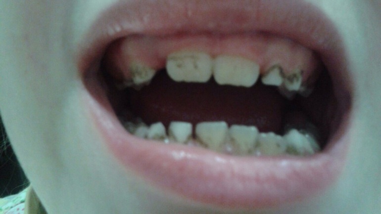 подскажите, у девочки, 7 лет, живет в г. Ливны, на молочных зубах черный налет, регулярно счищают у стоматолога, налет образуется опять, прорезались коренные, на них тоже налет.