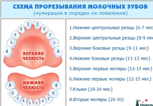 Зубки у дочки начали прорезаться в 6,5 мес. "Лезли пачками", то есть в 6,5 мес. 4 шт сразу (1,1,2,2 на картинке), потом ближе к 10 мес. вылезли все клыки и ОДИН боковой нижний резец (7,7,7,7,4 на картинке). В 11 мес полезли сразу 4 жевательных (моляры, 5,5,6,6 на картинке). И до сих пор (нам 1,5 года) нет верхних боковых резцов и одного нижнего бокового резца!!! Я волнуюсь, боюсь, что они вообще не вырастут. Может ли такое быть?