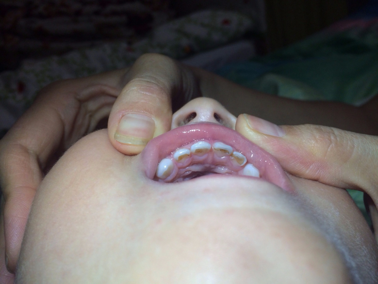 Здравствуйте доктор! Помогите пожалуйста я в панике, что с нашими верхними передними зубами? и с 4-кой? Как я вижу на передних изнутри эмали вообще не осталось?Сыну 1 сентября будет 3 года , зубы чистим с боем, поэтому вот эту картину обнаружила только сегодня, так как в рот заглянуть вообще не дает(((