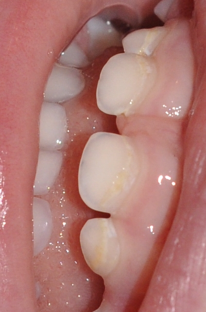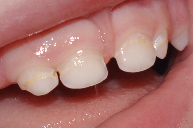 В нашей единственной стоматологии сказали следующее. Начальная стадия кариеса, повреждена эмаль, дентин пока не затронут. Рекомендовали серебрение, когда окончательно вылезут клыки - фторирование препаратом White Varnish.