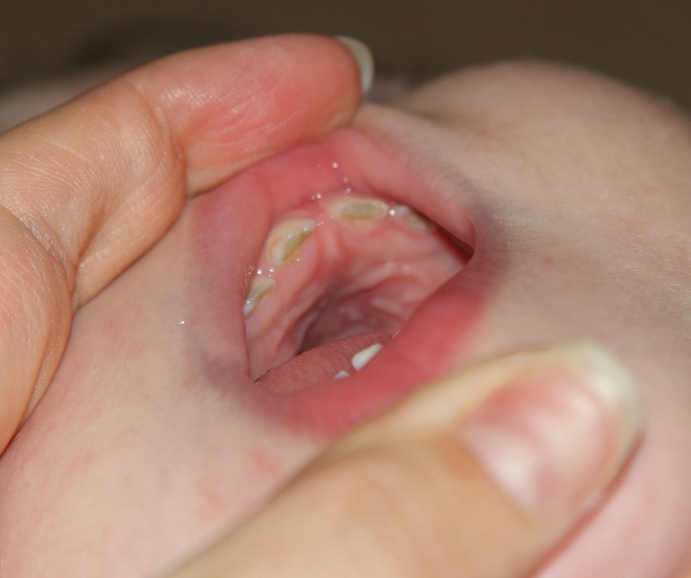 Здравствуйте. Ребенку 1,6. Где то в год и 2 начали появляться лумки на передних верхних зубках. Глупая, не придала значения, сейчас вот расплачиваюсь. Ситуация сейчас такая (фото). В одной клинике сказали, что гипоплазия эмали и надо проводить какую то реминерализацию: вроде дентин в клинике и тусс мусс два раза в день. В другой, что банальный кариес, но лечить не будут и надо серебрить. Что делать? Обзвонила все клиники, сказали, лечить не будут, так как маленькая совсем. Как быть...понимаю, что надо лечить, согласны с папой держать, но врачи не берутся. Говорят, дотяните хотя бы до 2,3, а там решим.