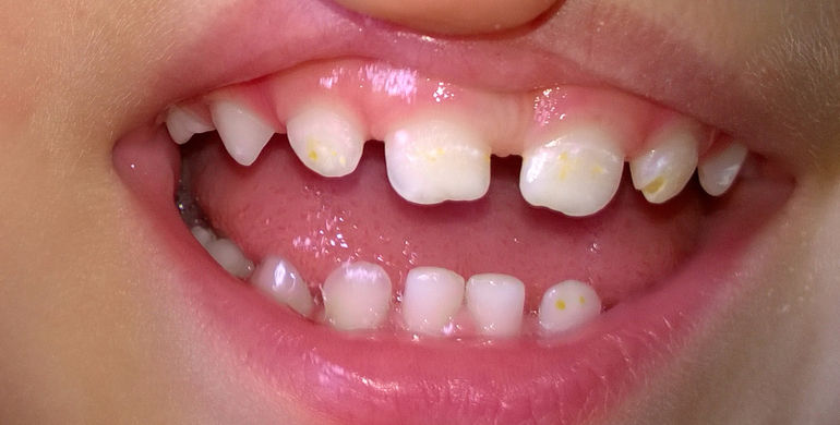Моей дочке сейчас 1 год 10 месяцев, были на приеме у стоматолога, сказали на 4 верхних и одном нижнем кариес в начальной стадии. Фото прилагаю( одно без вспышки, другое со вспышкой было сделано)
