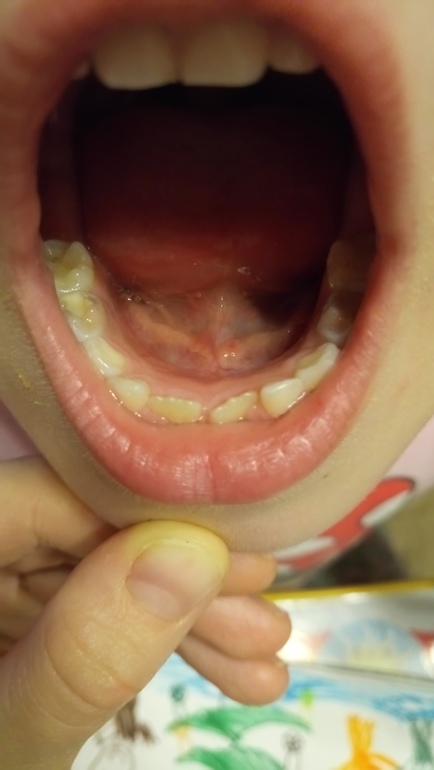 А вот левый 4ый зуб ребенка стоит показать врачу . Смущает его серость.