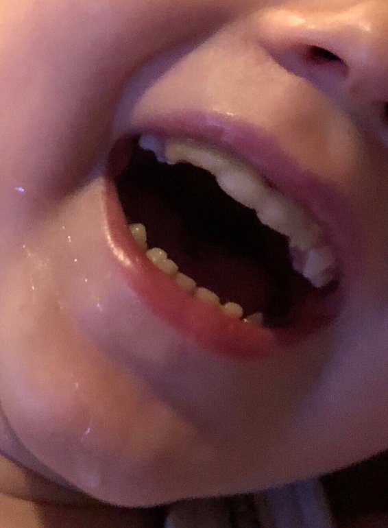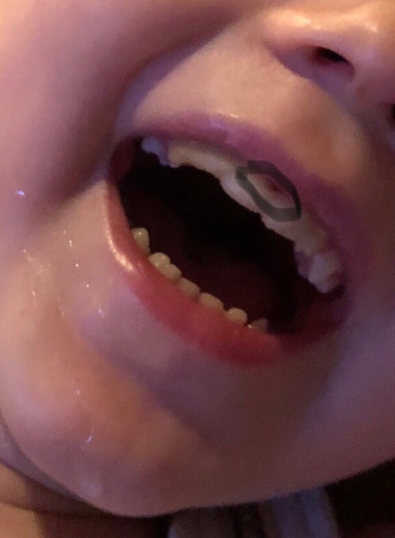 На одной фотографии я обвела красную точку. Это наша травма. Капа приклеена к зубкам, чтобы как-то зафиксировать их. С трудом сфотографировали. Получилось только так.