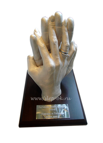 Этот подарок заслуживает того, чтобы стать семейным талисманом. Сомкнутые руки молодых, запечатленные в гипсе, символизируют неразрывность их союза и крепость их чувств. Этот подарок сохранится и до их золотой свадьбы - как же дорог он будет для них в это время! И с каким теплом они вспомнят друзей и родных, сделавших им такой чудесный свадебный подарок. Наш сайт www.slep-ok.ru