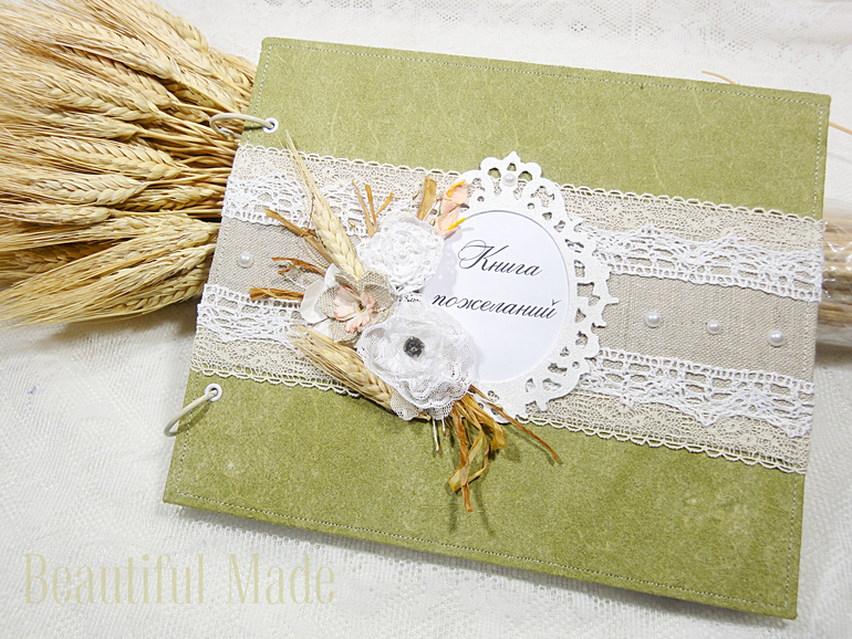 Декорирована зеленой натуральной замшой, хлопковым кружевом,