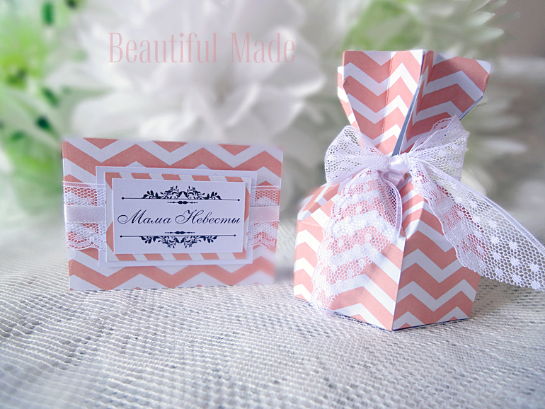 Изумительный свадебный набор, который состоит из приглашения, необычной бонбоньерки и банкетной карточки. Выполнены из плотной дизайнерской бумаги и украшены кружевом.