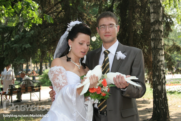 Пока оделась, накрасилась (хороша все-таки тушь орифлейм "очевидный эффект", у меня потом многие спрашивали, за сколько я ресницы нарастила, а я и не думала их наращивать), время было уже 12. А жениха всё нет. Благословили меня мама с бабушкой, последние приготовления к выкупу, небольшая репетиция..... "Еееедут!!!!"