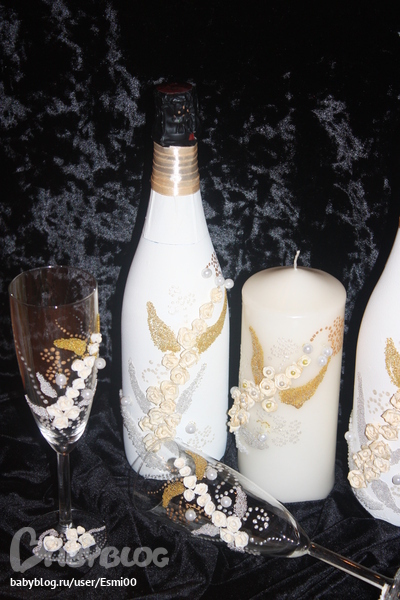 Очень нежный набор с объемными элементами - выглядит богато конечно...судить не берусь, т.к. ни свечи, ни бокалы ни бутылки никогда не делала :-)