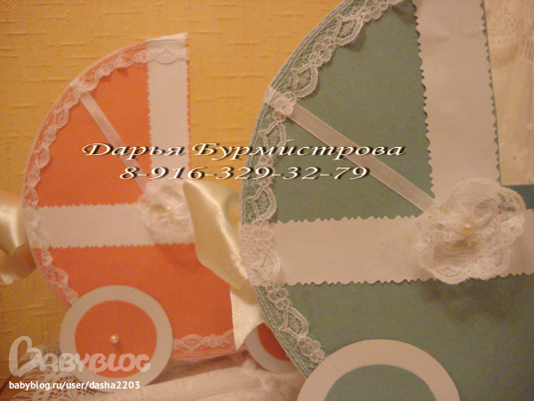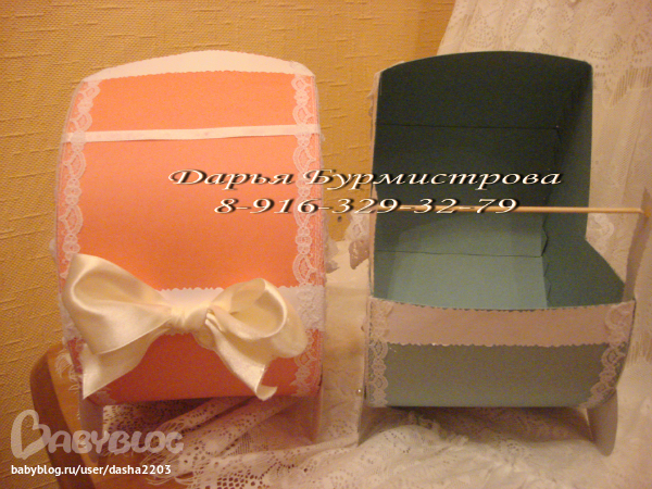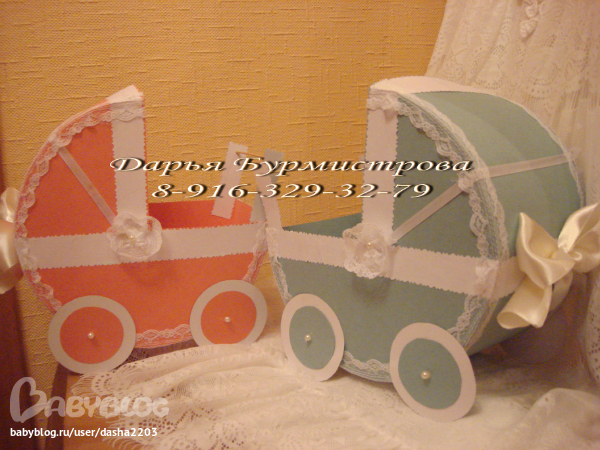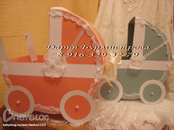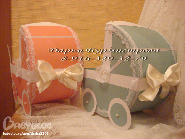Коляски для конкурса сбор денег на мальчика/девочку.Выполнены из картона,кружева,лент и жемчужных бусин.Интересная альтернатива стандартным "ползункам",останутся с вами на память.Красивый аксессуар для фотосессий.Пара колясок-700р.